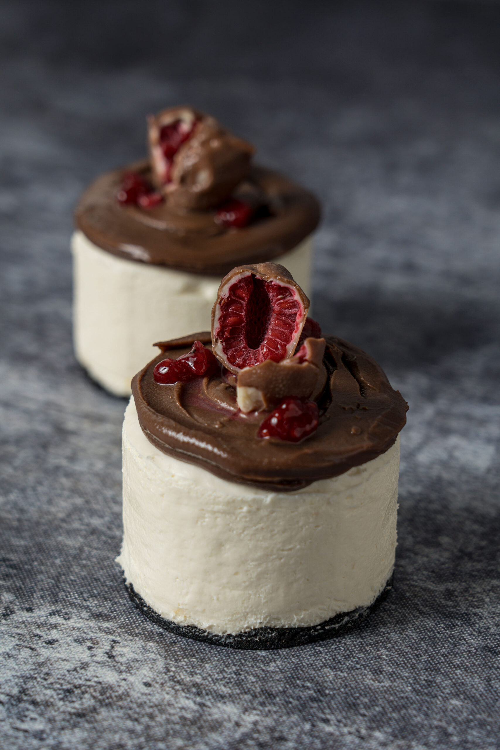 Con crocante de chocolate blanc co con corazón de frambuesa y ganache de chocolate con franui.