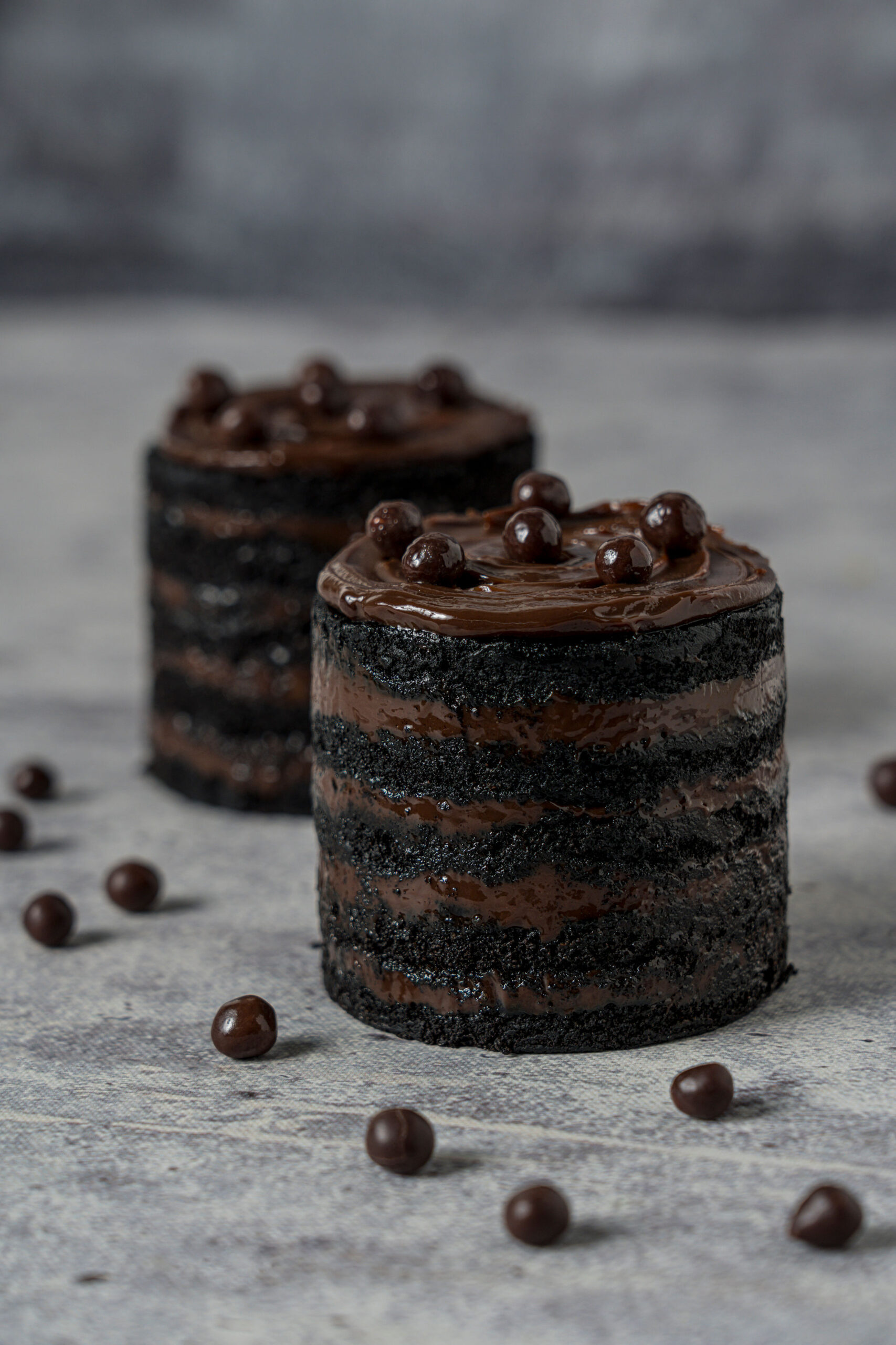 Bizcochuelo de chocolate con relleno de ganache de chocolate.